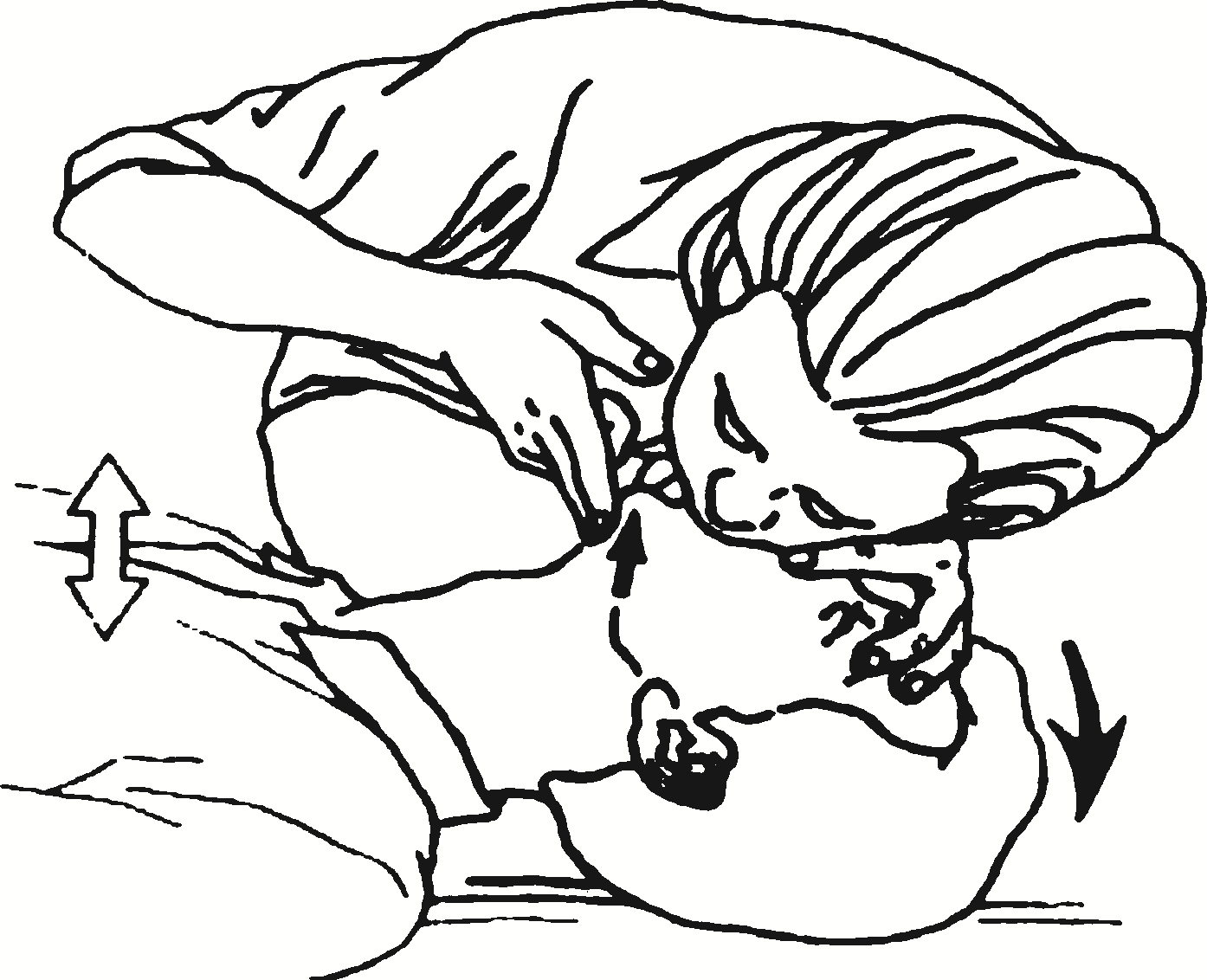 ? ? ? ?開(kāi)放氣道應(yīng)先去除氣道內(nèi)異物。如無(wú)頸部創(chuàng)傷,清除口腔中的異物和嘔吐物時(shí),可一手按壓開(kāi)下頜,另一手用食指將固體異物鉤出,或用指套或手指纏紗布清除口腔中的液體分泌物。