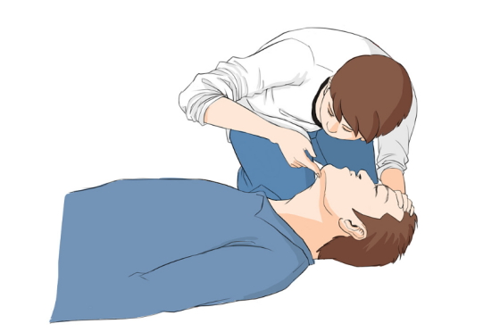 ? ? ? ?如患者無(wú)呼吸,立即進(jìn)行口對(duì)口人工呼吸。摸頸動(dòng)脈,如果能感覺(jué)到搏動(dòng),那么僅作人工呼吸即可。為防止細(xì)菌感染,采用接口套,用酒精消毒。施救者一手捏住患者鼻子,大口吸氣,屏住,迅速俯身,用嘴包住患者的嘴,快速將氣體吹入。與此同時(shí),施救者的眼睛需觀察患者的胸廓是否因氣體的灌入而擴(kuò)張,氣吹完后,松開(kāi)捏著鼻子的手,讓氣體呼出,這樣就是完成了一次呼吸過(guò)程。每分鐘平均完成12次人工呼吸。